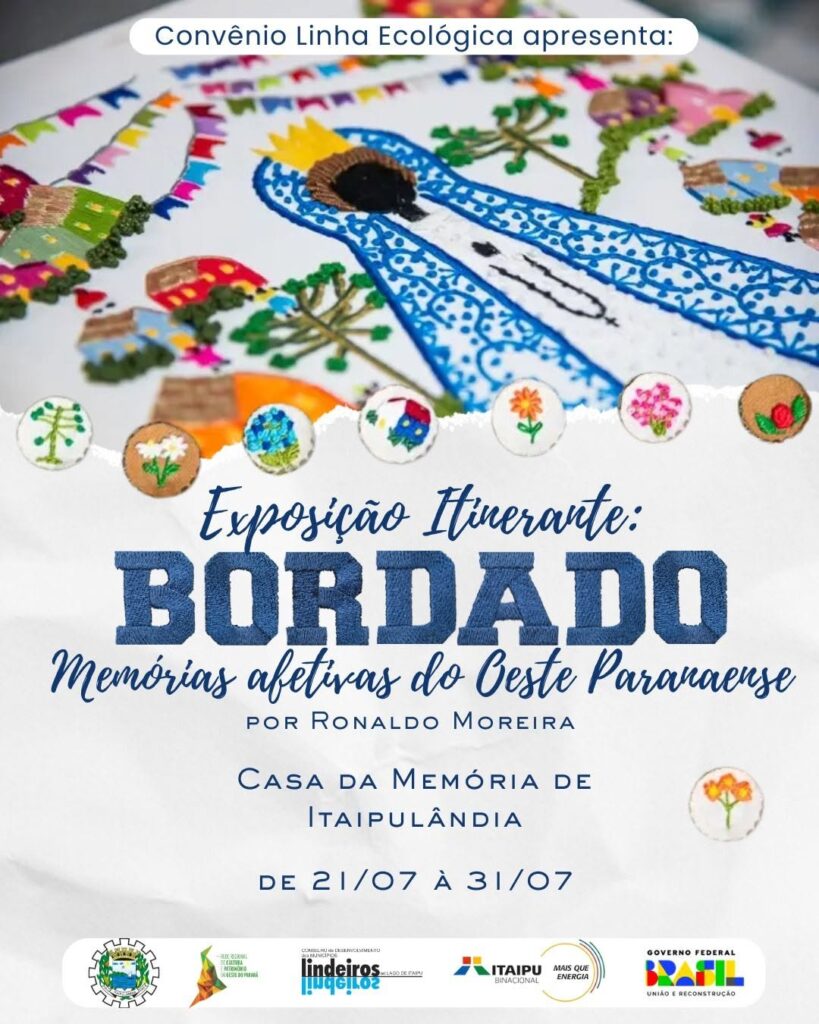 Itaipulândia (PR) – A partir do dia 21 de julho, o município de Itaipulândia recebe a Exposição Itinerante “Bordado: Memórias Afetivas do Oeste Paranaense”, assinada pelo artista Ronaldo Moreira, com curadoria do Instituto IDESS. A mostra, que permanece até o dia 31 de julho na Casa da Memória, é uma realização do Conselho dos Municípios Lindeiros, no âmbito do Convênio Linha Ecológica, em parceria com a Prefeitura Municipal de Itaipulândia e apoio da Itaipu Binacional.