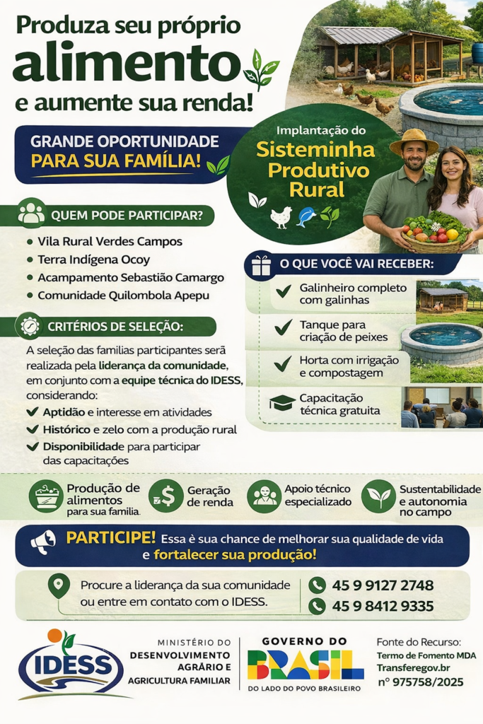 O IDESS – Instituto de Desenvolvimento Econômico Setorial Sustentável iniciou a implantação de um importante projeto voltado à produção de alimentos e geração de renda em comunidades rurais de São Miguel do Iguaçu.