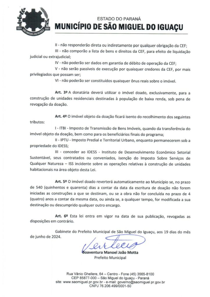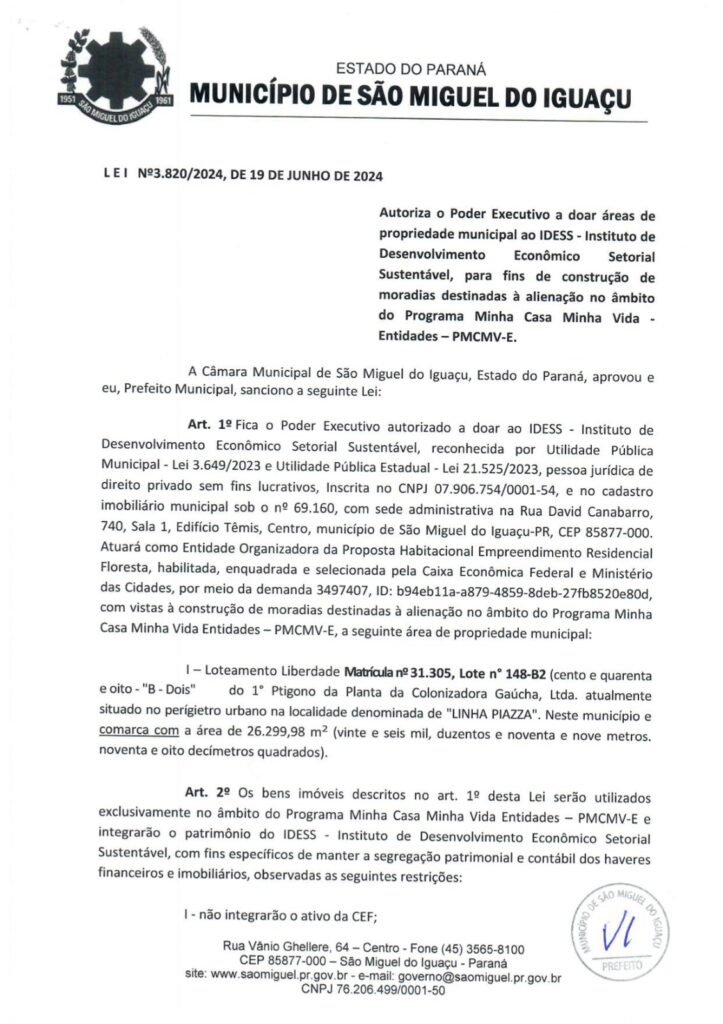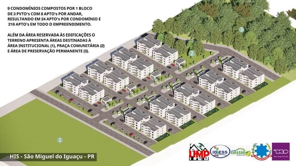 Governo Municipal doa imóvel para o Programa Minha Casa Minha Vida Entidades. O IDESS afiliado a UMP-PR apresentou propostas e foi selecionado 50 apartamentos com investimentos de R$ 7.150.000,00. O terreno avaliado em R$ 3.944.997,00 atendera 216 famílias ao final do projeto.